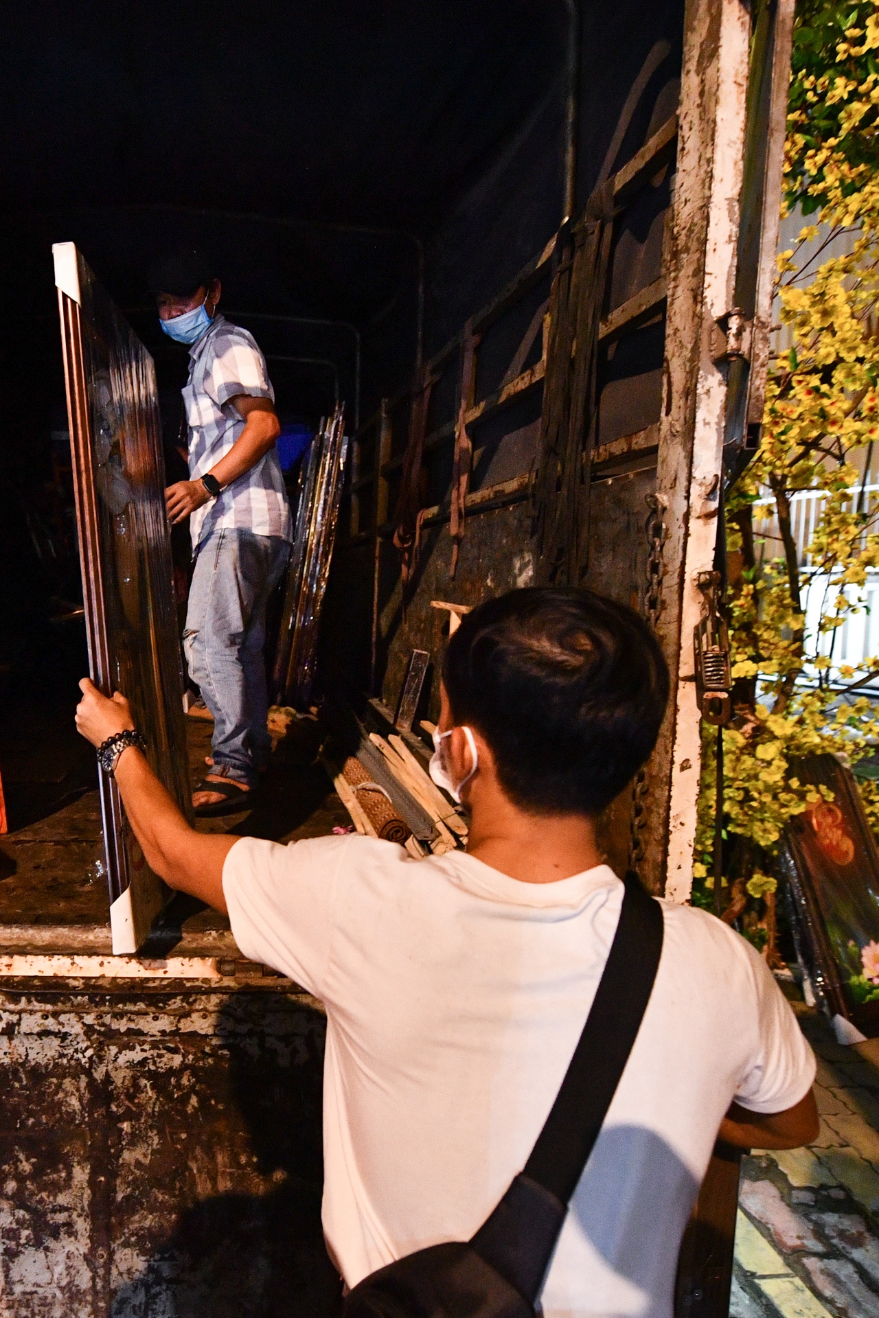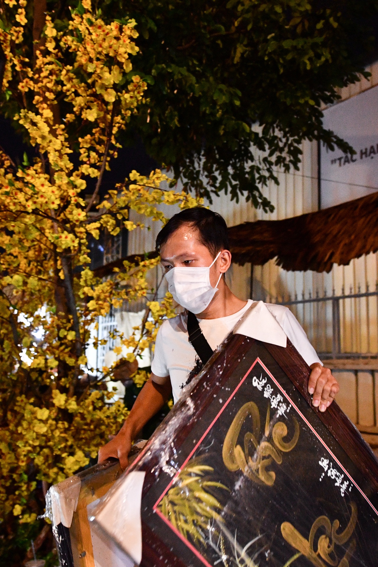 | Tôi dự định làm việc ở đây đến ngày 29 Âm lịch rồi tiếp tục cho chữ ở Việt Nam Quốc Tự đến mùng 5 Tết, tuy nhiên do Covid-19 diễn biến phức tạp, nhiều hoạt động công cộng của thành phố, trong đó có phố ông đồ, phải tạm dừng hoạt động từ ngày mai (tức 28 Tết). 21h, anh Hưng vội vã chuyển những bức liễn, đối, tranh chữ của tôi lên xe tải. |