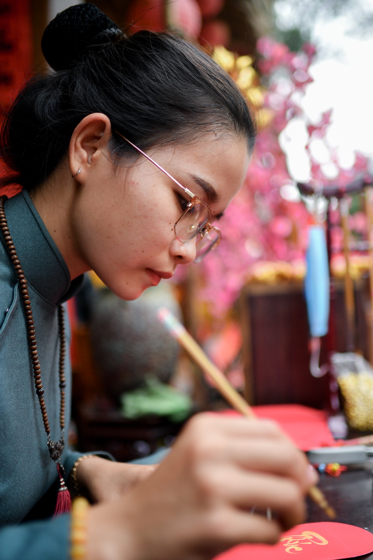Khách đến đây đa dạng lứa tuổi. Hầu hết sẽ xin chữ lên giấy hoặc bao lì xì để làm quà tặng. “Bình an”, “thịnh vượng”, “hạnh phúc”... là những chữ mọi người hay xin nhất. Tôi cũng nhận viết lời chúc theo yêu cầu. Mỗi bức mất khoảng 5-10 phút nắn nót. |