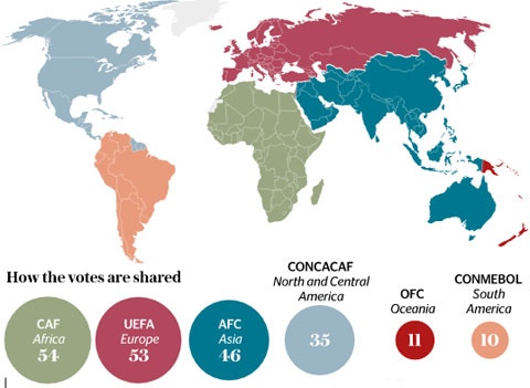 | Phân chia phiếu bầu chủ tịch FIFA: châu Phi 54 phiếu, châu Âu 53, châu Á 46, Bắc và Trung Mỹ 35, châu Đại Dương 11 và Nam Mỹ 10. |