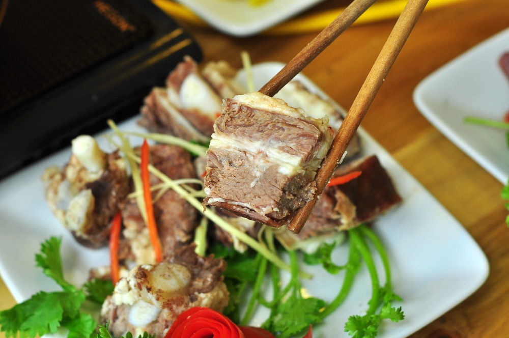 Sườn bò cũng là món đặc biệt, ít quán bán. Miếng sườn dày thịt. Miếng sườn nào có sụn, khách cứ để ninh lâu cho mềm nhừ rồi mới gặm, sẽ rất thích thú.