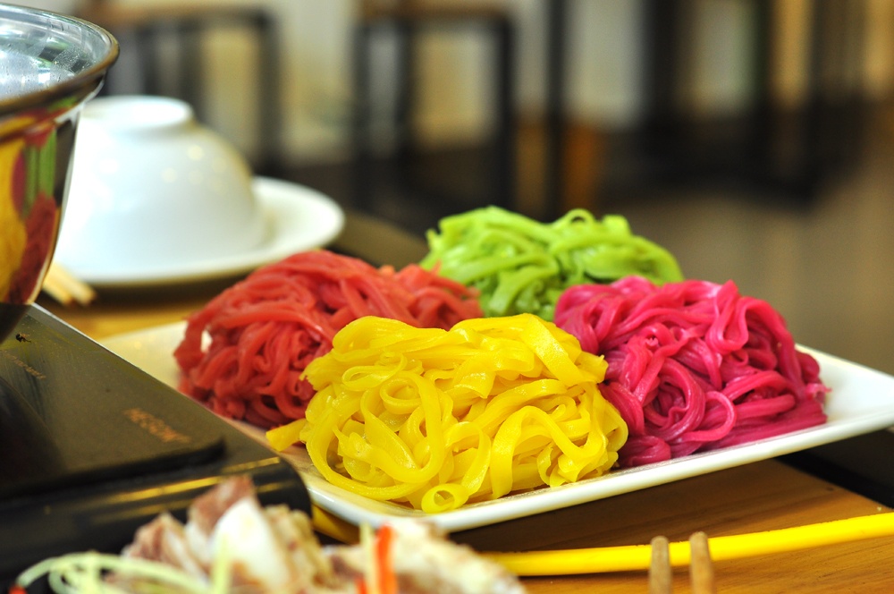 Một điểm thú vị nữa, tinh bột ăn cùng lẩu bò bát bửu không phải mỳ, miến mà là loại phở sắc màu rất lạ. Màu của phở xanh, đỏ, vàng... được quảng cáo là chế biến từ nguyên liệu tự nhiên như vàng của bí ngô, đỏ của gấc hay tím từ củ dền...