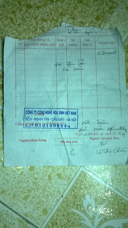 “Giấy chứng nhận” mà người này đưa cho chị Ngần là một hóa đơn không còn nguyên vẹn, có dấu của Công ty Công nghệ Hóa sinh Việt Nam có địa chỉ tại số 9 Nghĩa Tân, Hà Nội với tên người viết hóa đơn là Lê Thị Chúa.