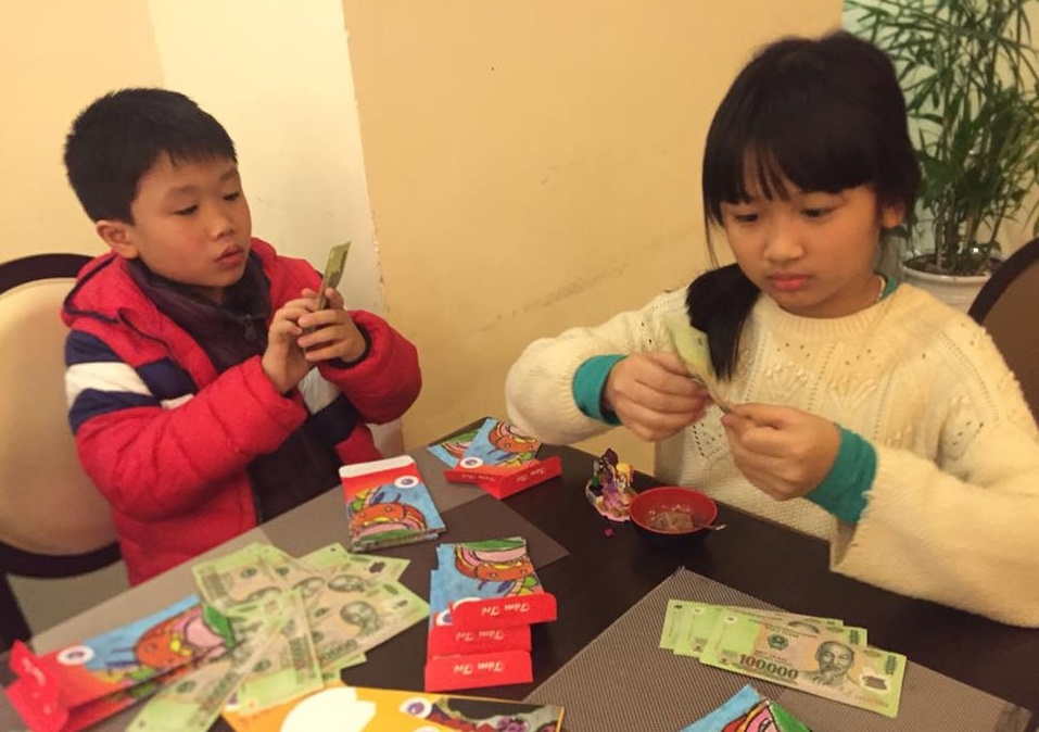 Các bé tự tay chuẩn bị phong bao lì xì cho các bệnh nhân chạy thận . |
