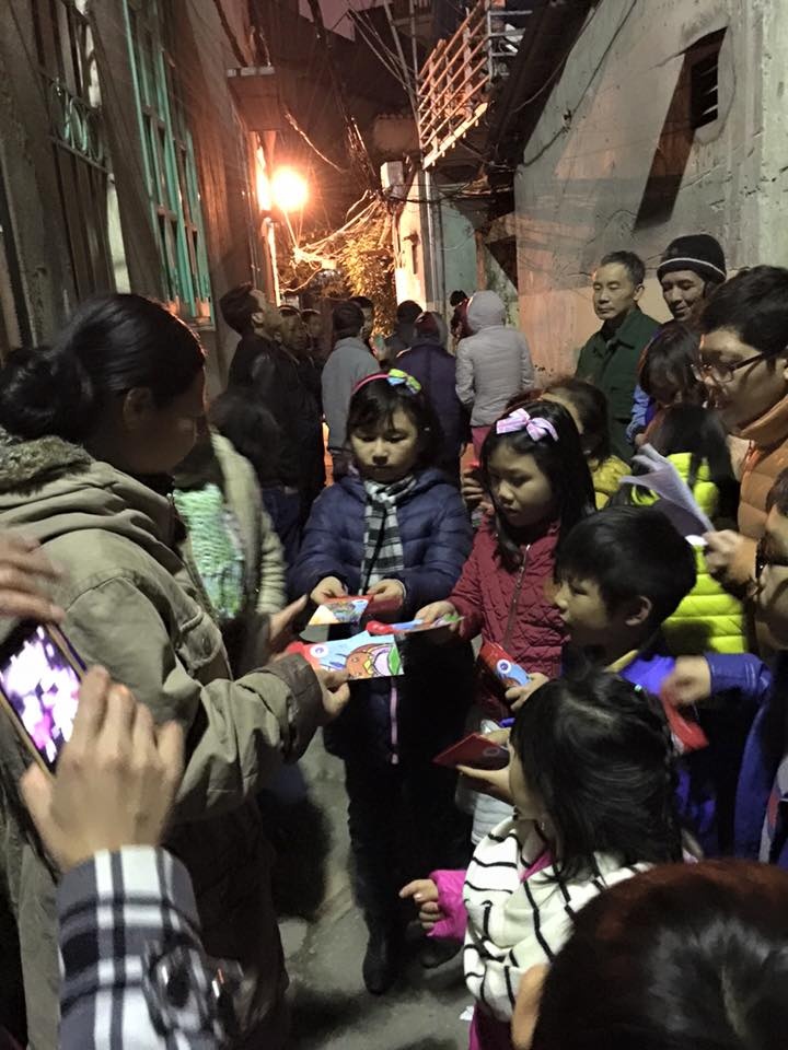 Nhóm gồm khoảng 20 phụ huynh và các bé tiểu học, trong dịp Tết này đến xóm chạy thận Lê Thanh Nghị để tặng áo ấm, quà Tết và những phong bao lì xì mừng năm mới.