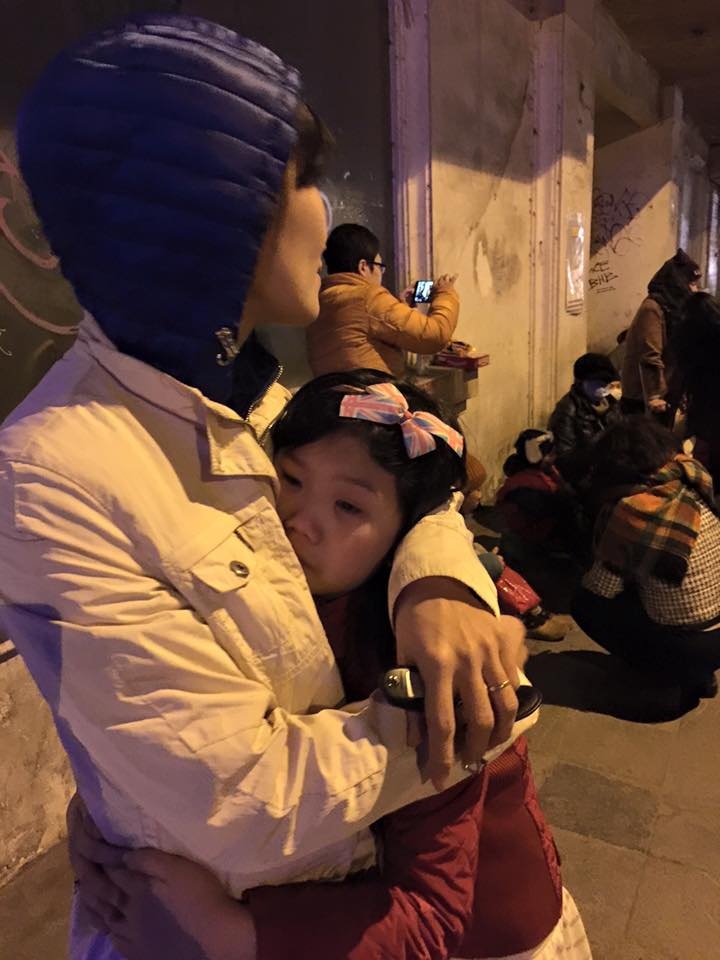 Thương cảm với những người vô gia cư, bé Thanh Mai đã bật khóc trong vòng tay mẹ. |