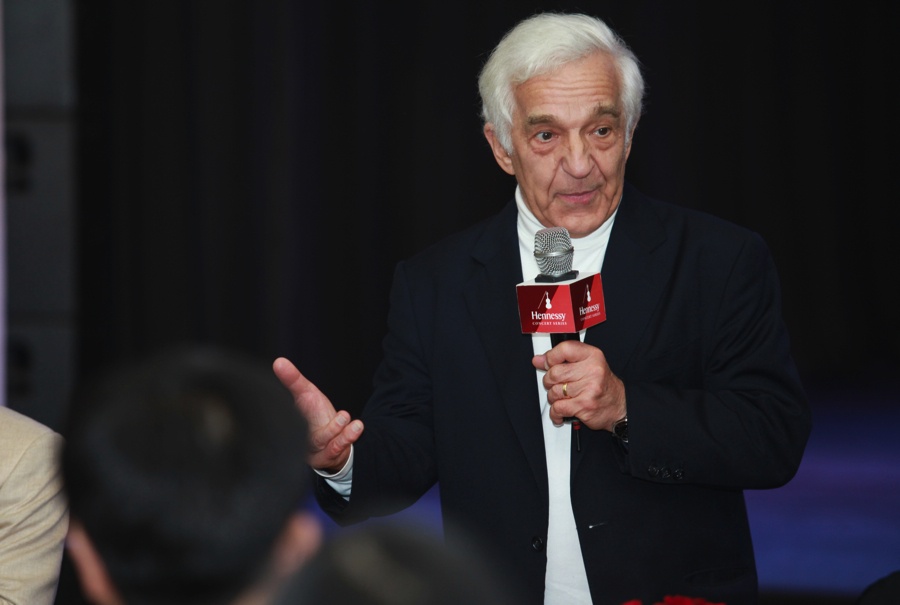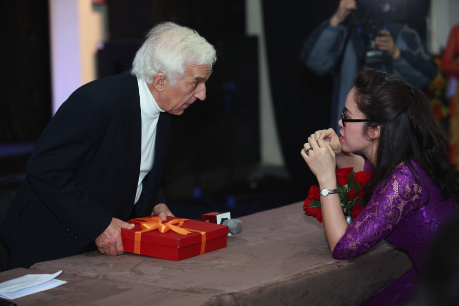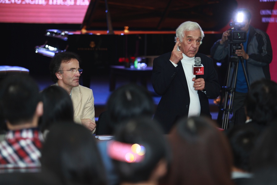 | Vừa trải qua một chặng bay dài và chỉ có mặt ở Hà Nội trước buổi giao lưu không lâu, nhưng Vladimir Ashkenazy vẫn nhiệt tình trả lời câu hỏi của các bạn sinh viên. |