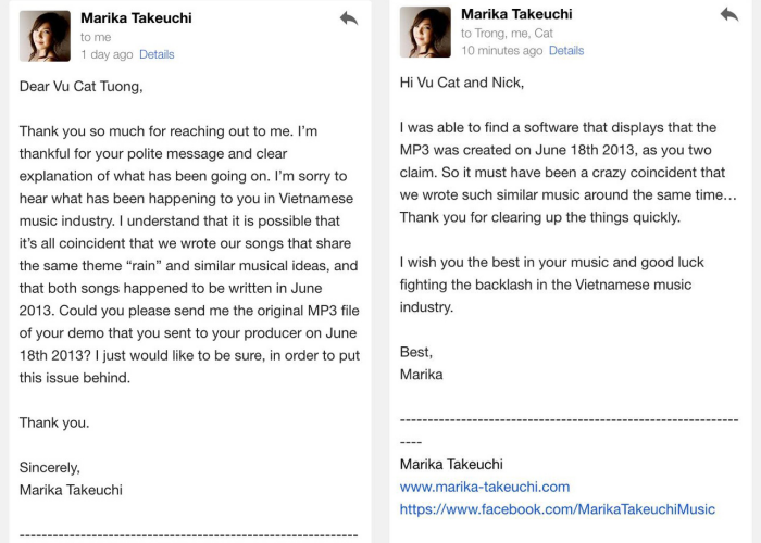 | Vũ Cát Tường trực tiếp liên hệ với phía nữ ca sĩ Nhật để nói về nghi vấn đạo nhạc. Ảnh: NVCC. |