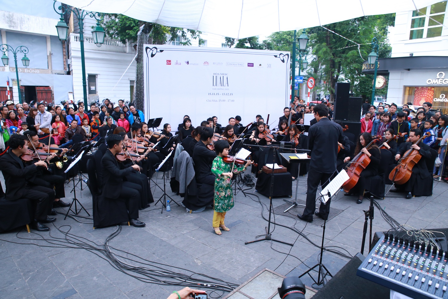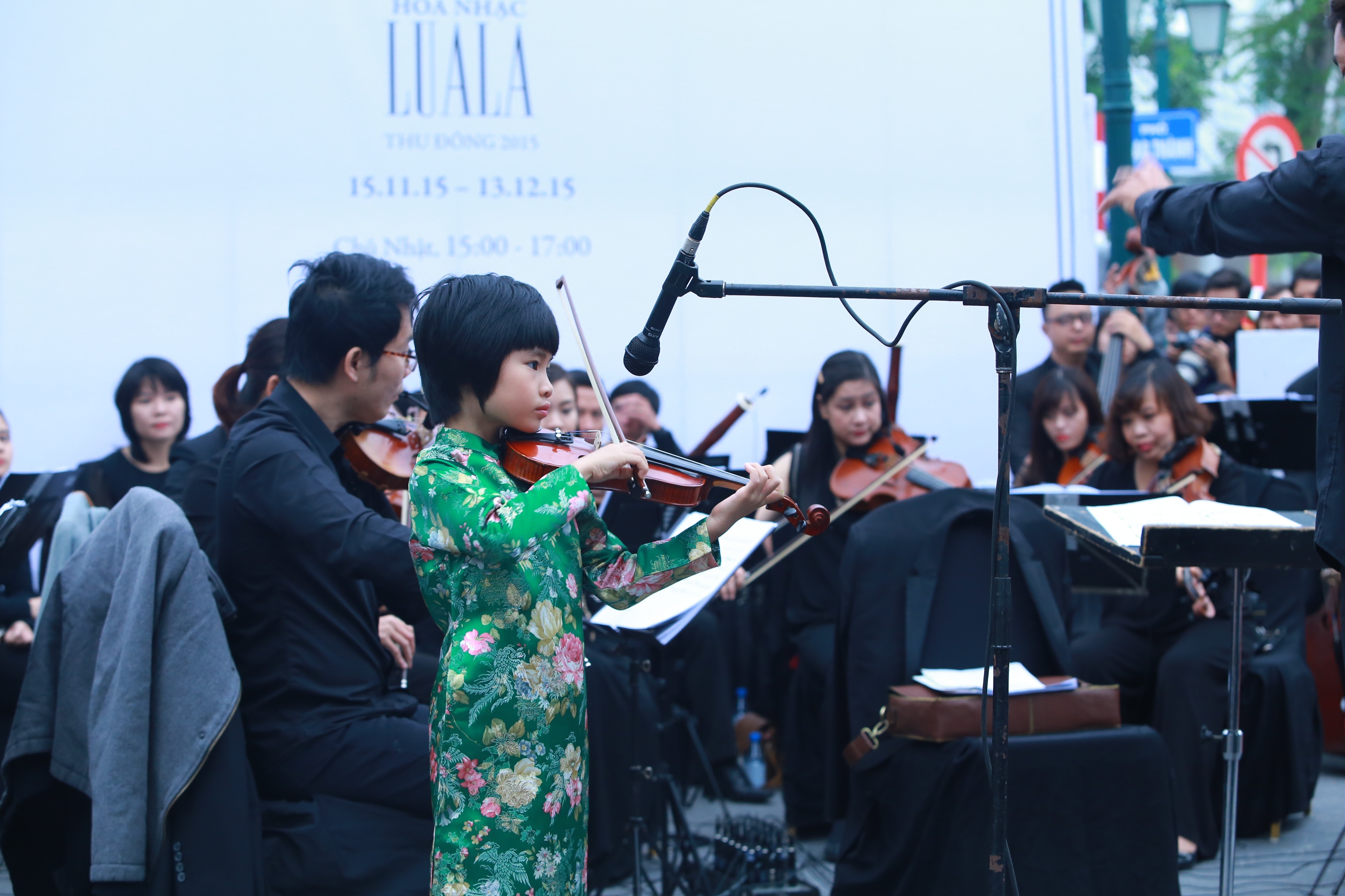 | Tuần thứ 3 của Luala Concert 2015 thu hút sự chú ý của khán giả thủ đô bởi sự góp mặt của nghệ sĩ nhí Nguyên Lê. Em mặc áo dài xanh in hình hoa, nổi bật giữa dàn nghệ sĩ diện toàn đồ đen. |
