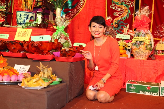 | Nghệ sĩ Mỹ Uyên thành tâm bên mâm cỗ cúng Tổ ngành sân khấu. |