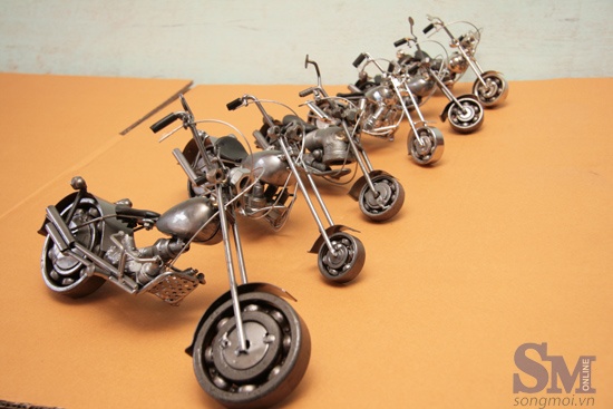 Một chiếc xe mô hình sắt có thể lên tới 7-10kg, chiếc nào nhẹ thì cũng xấp xỉ 1kg và được cấu thành bởi 20-50 chi tiết từ phế liệu động cơ xe máy, xe hơi các loại. Vì vậy riêng việc phân loại nguyên vật liệu để đưa vào lắp ráp cũng tốn rất nhiều thời gian. Sau đó, người thợ phải xử lý bề mặt phế liệu kim loại vốn rất bẩn bằng cách đánh bóng nhiều lần, rồi phủ dung dịch chống gỉ sét đến từng ngóc ngách sản phẩm.