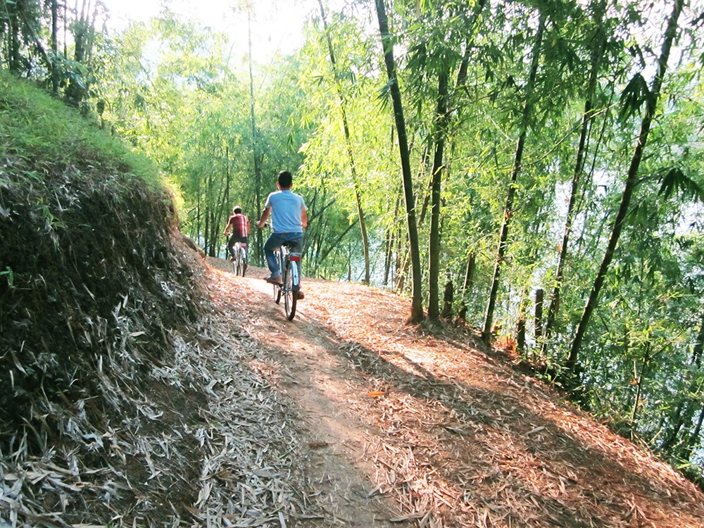 Bạn có thể chọn đạp xe hoặc đi bộ khám phá xung quanh bản làng, đó là trải nghiệm rất thú vị. Con đường nhỏ xinh nằm giữa những hàng tre, bên cạnh là dòng sông Đà thanh bình với những chòi bắt tôm cá, những con dốc bạn phải đạp hết sức để rùi được thả dốc trong tiếng cười giòn giã.