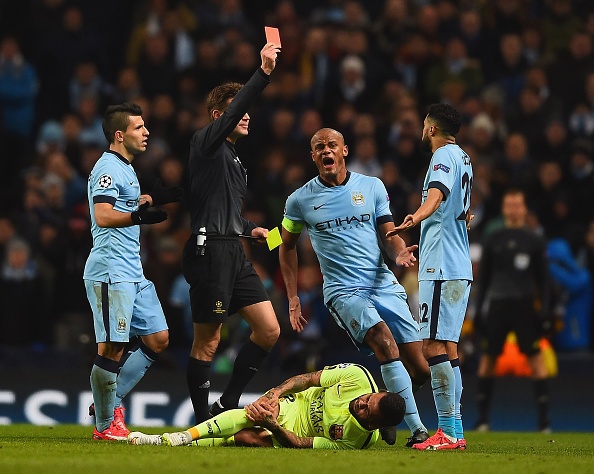 | Hậu vệ Gael Clichy của Man City nhận thẻ vàng thứ 2 sau pha phạm lỗi với Dani Alves. Ảnh: Getty Images. |