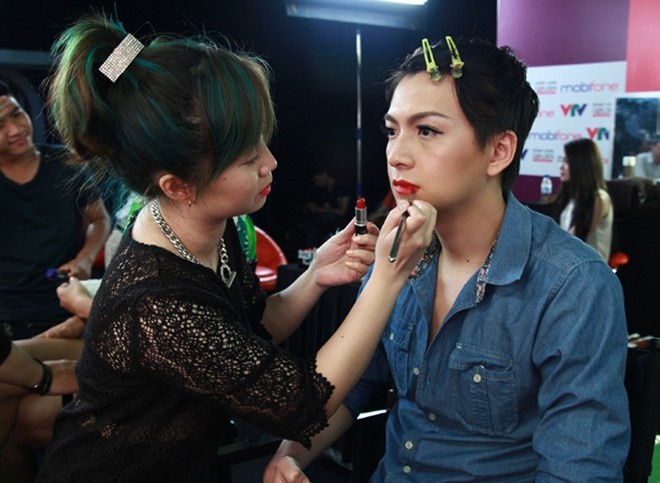 | Ngô Kiến Huy được đội ngũ hóa trang make-up cẩn thận trong hậu trường. |