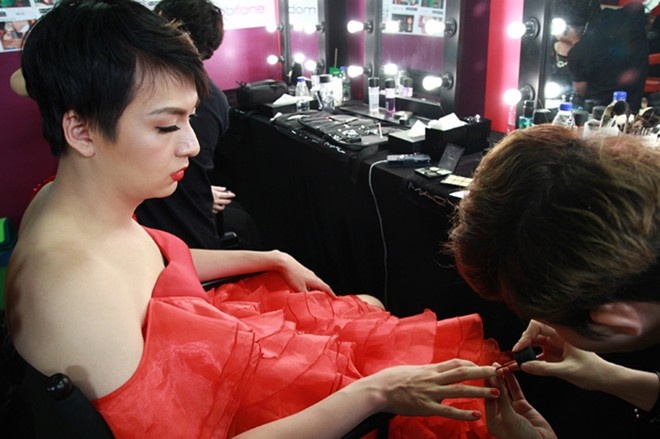 | Nam ca sĩ được chăm sóc cẩn thận từ trang phục, khuôn mặt, mái tóc cho tới màu sơn móng tay trước khi lên sân khấu. |