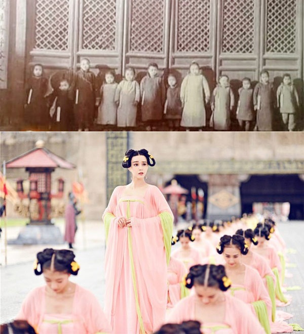 | Trong phim Võ Mỵ Nương truyền kỳ, các cô gái trẻ đi tuyển tú nữ đều xinh đẹp như Phạm Băng Băng (ảnh dưới). Thế nhưng thực tế, nhiều thiếu nữ mới 11 tuổi, cơ thể vẫn còn rất bé đã tham gia thi tuyển (ảnh trên). |
