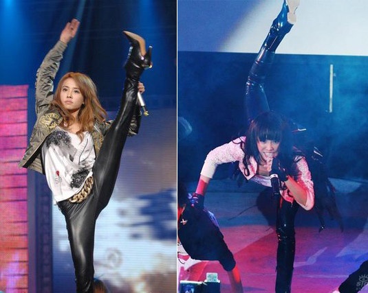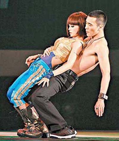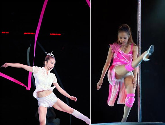 | Thái Y Lâm luôn biết tận dụng cơ thể mềm dẻo của mình làm cho phần trình diễn thêm sôi động. Không chỉ có múa cột, nhảy đơn thuần, Thái Y Lâm còn đưa rất nhiều... bộ môn thể dục dụng cụ vào bài biểu diễn, như múa lụa, ngựa tay quay,... |