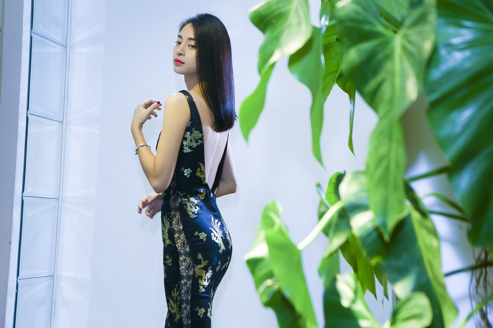 | Trong buổi thử trang phục NTK Thủy Nguyễn, Ngô Thanh Vân khéo chọn những bộ đầm tối màu, họa tiết nền nã. Thiết kế giúp người đẹp khoe lưng trần gợi cảm và cuốn hút. |
