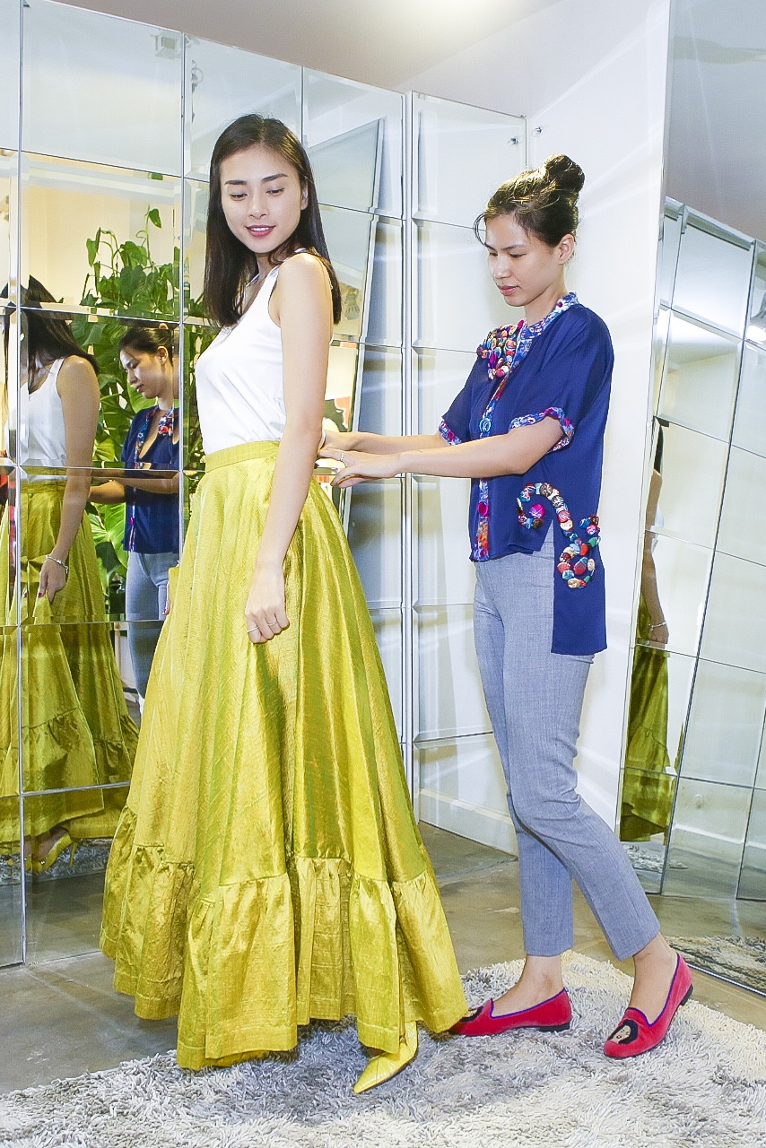 | NTK Thủy Nguyễn hỗ trợ người đẹp thử trang phục trình diễn trong đêm Đẹp Fashion Runway 4 , diễn ra tại Hà Nội. |