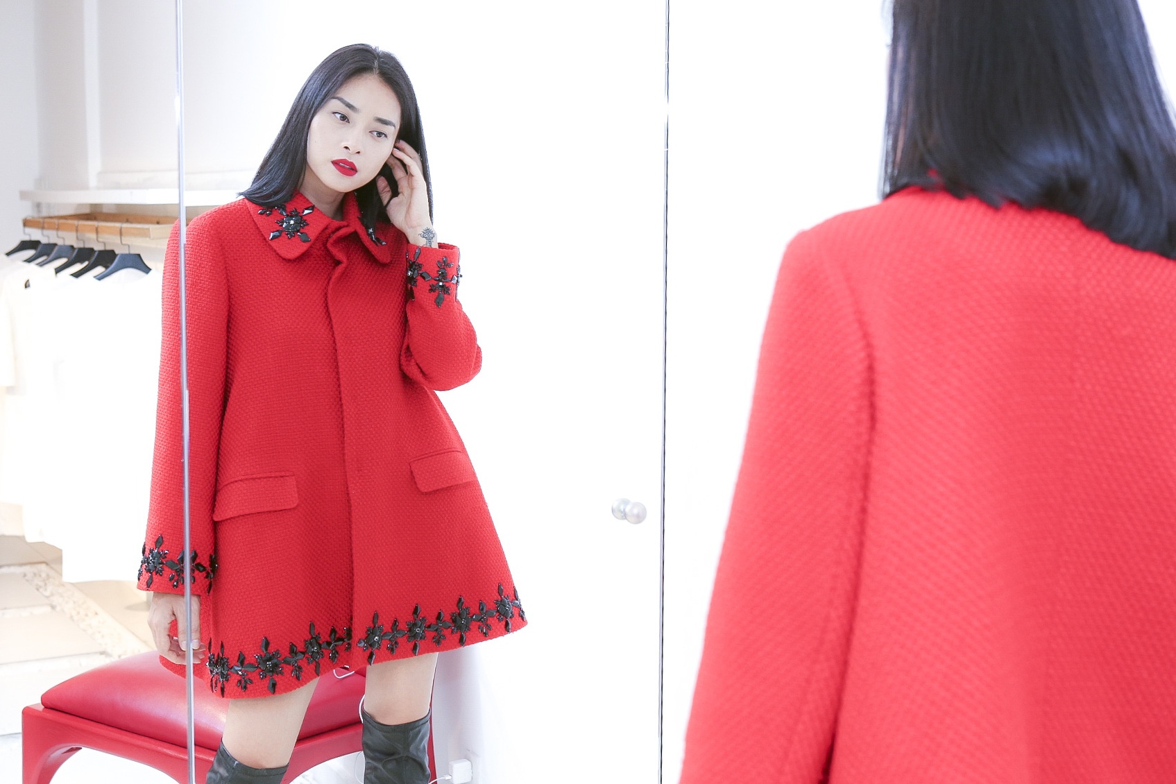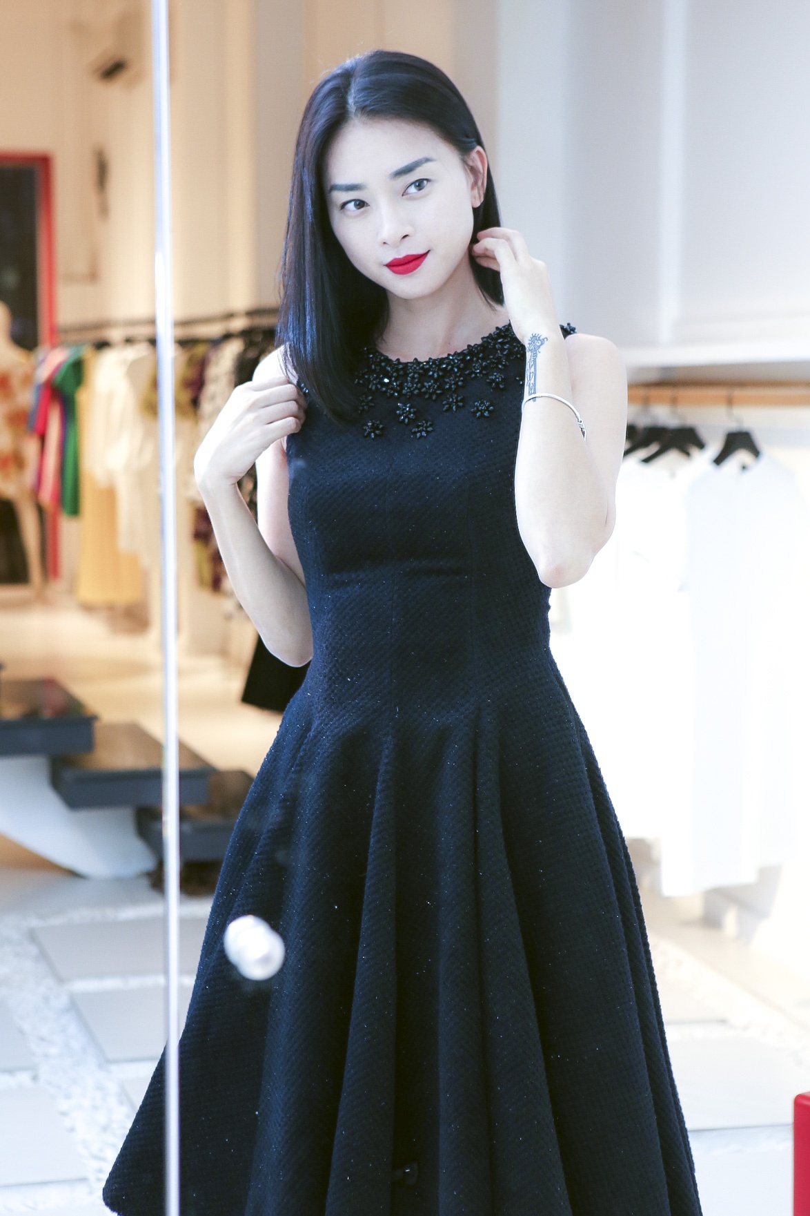 | "Đả nữ" làm duyên trước ống kính khi thử mẫu đầm ưng ý. |