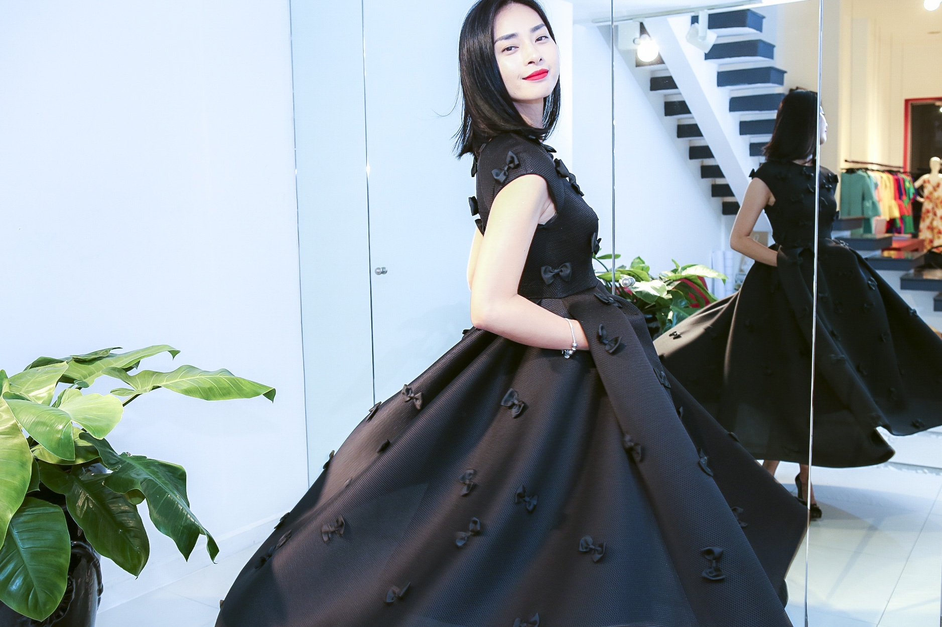 | NTK Đỗ Mạnh Cường Nhiệt tình chỉnh sửa trang phục cho người đẹp điện ảnh. Mẫu đầm có họa tiết nơ 3D duyên dáng được Ngô Thanh Vân hết lời khen ngợi. |
