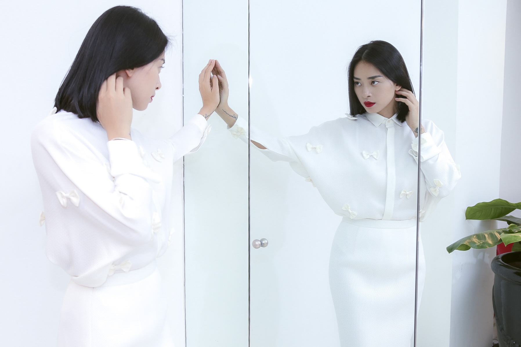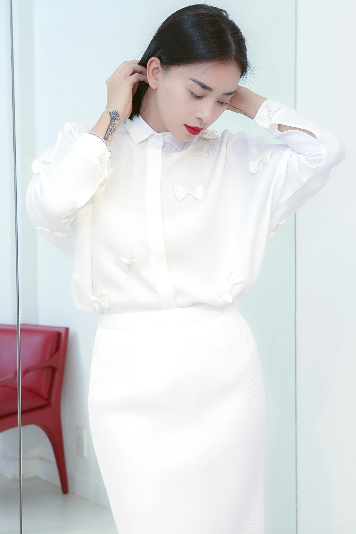 | Tông màu trắng cũng nằm trong list trang phục yêu thích của diễn viên Dòng máu anh hùng. Thiết kế áo kết hợp chân váy bút chì đồng màu tạo hình ảnh trong trẻo, thanh nhã. |