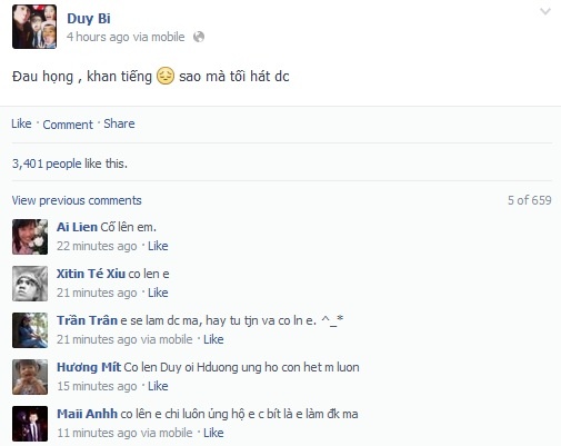 | Ít giờ trước, Ngọc Duy chia sẻ đang bị đau họng, khản tiếng, không biết có hát được không? |