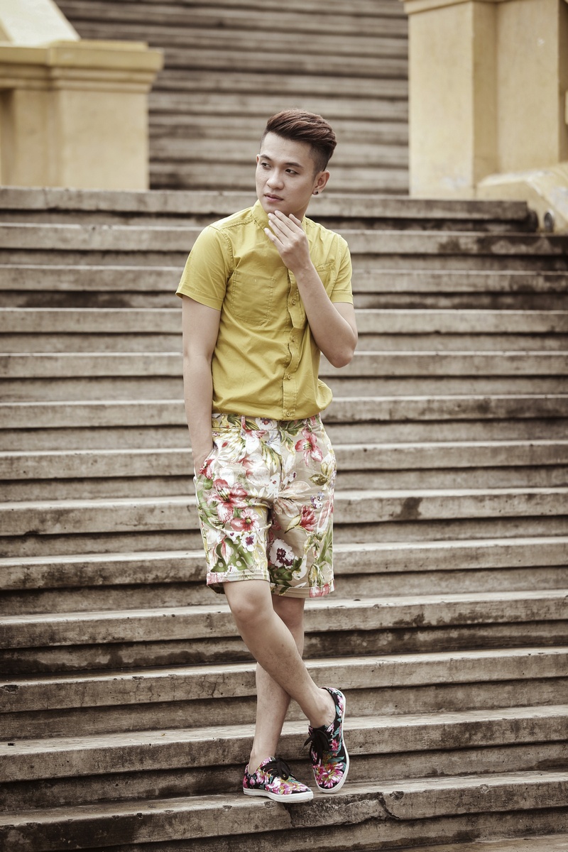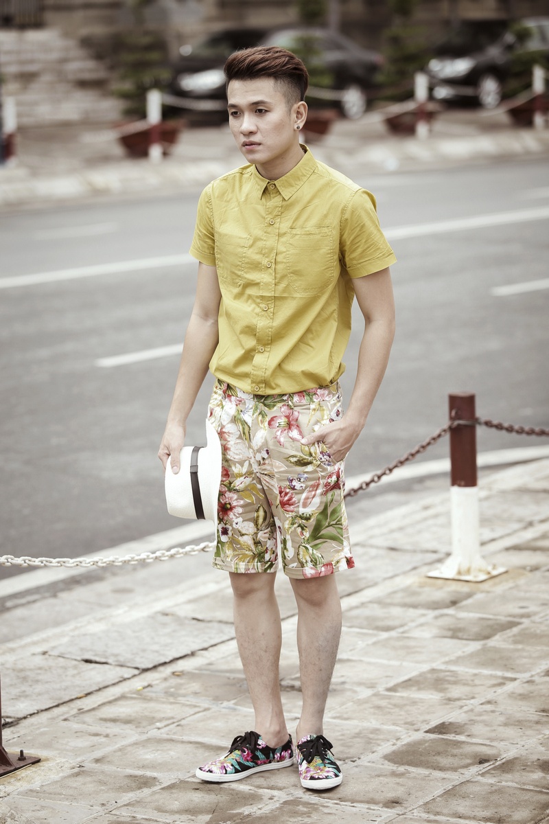 Một trong những set trang phục phù hợp với hình ảnh khỏe khoắn, mạnh mẽ của Ngọc Khanh. Áo sơ-mi tông màu vàng hợp xu hướng, phối ăn ý cùng quần shorts họa tiết hoa mùa hè nền nã.
