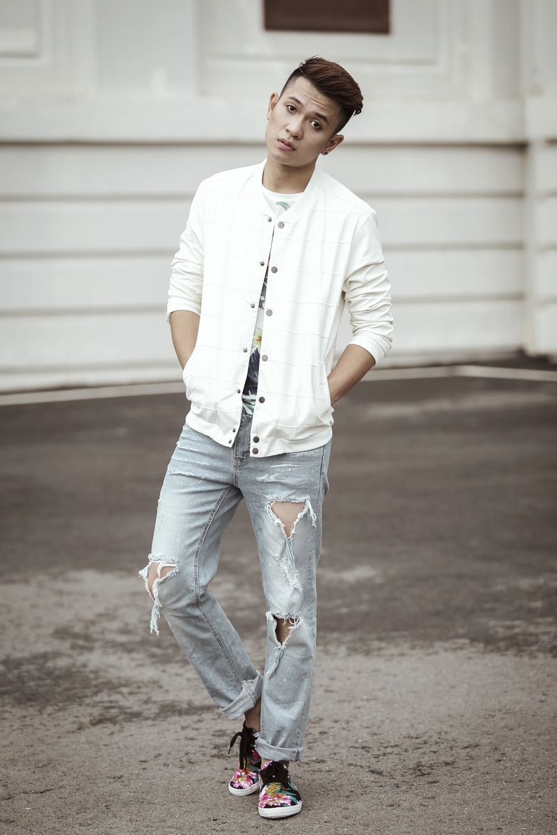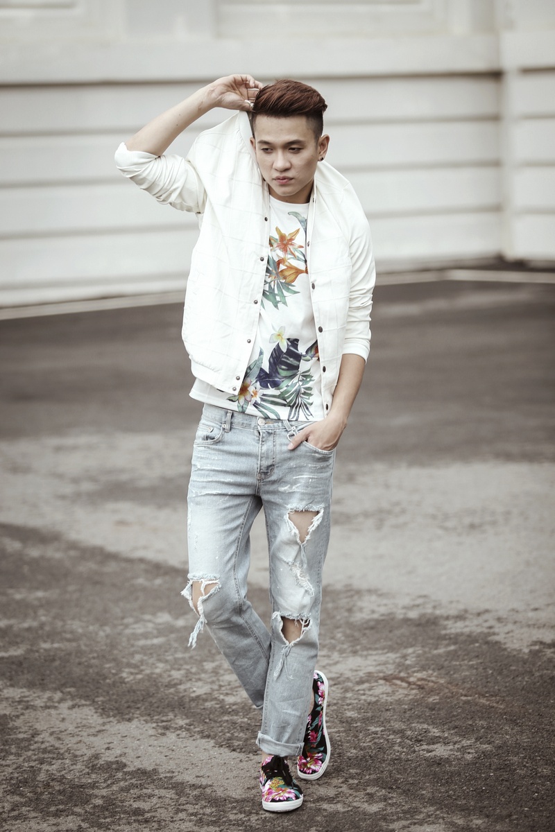 Với set đồ khác, nam ca sĩ thể hiện sự tự tin khi diện quần jeans rách, áo thun họa tiết và áo khoác nhẹ màu trắng tinh tế. Hình ảnh phủi bụi, đậm chất đường phố giúp giọng ca Vì sao đưa anh tới ghi điểm cộng gu thẩm mỹ.