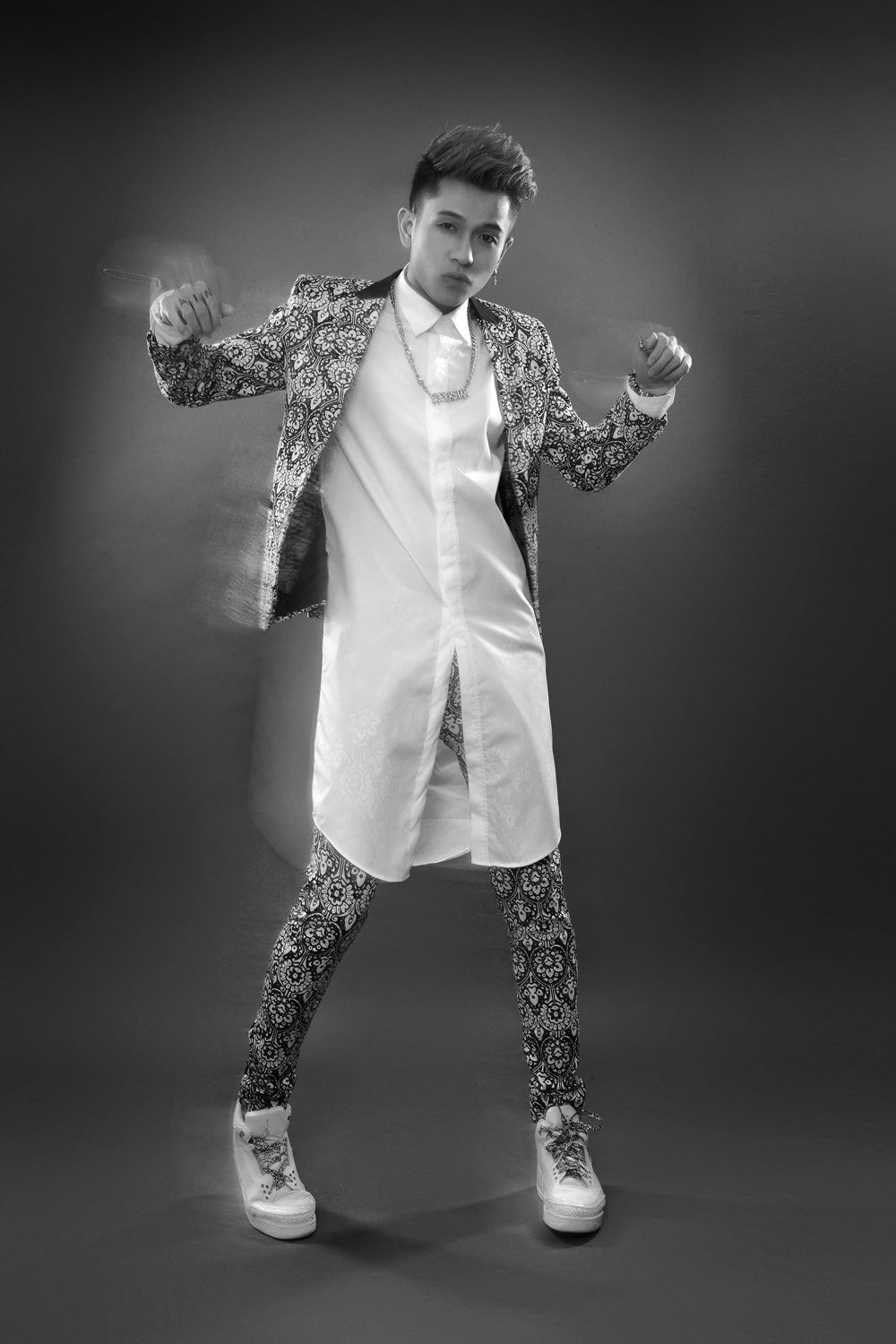 | Ngoài ra, cựu thành viên Vmusic còn rất táo bạo thể hiện bộ trang phục in họa tiết hoa lạ mắt. |