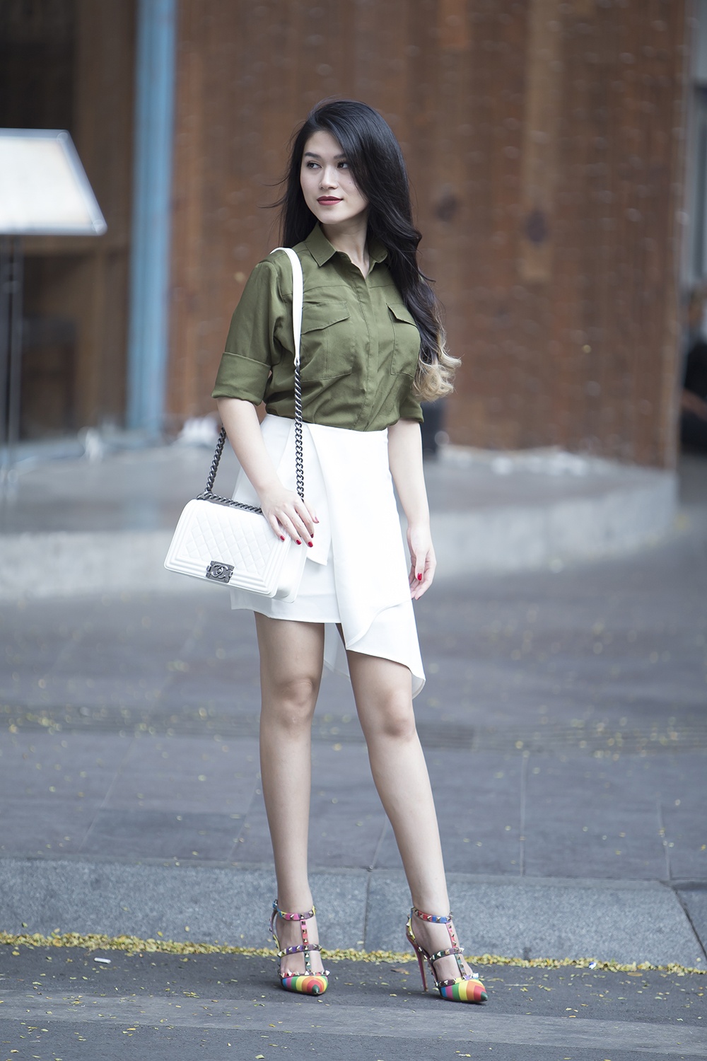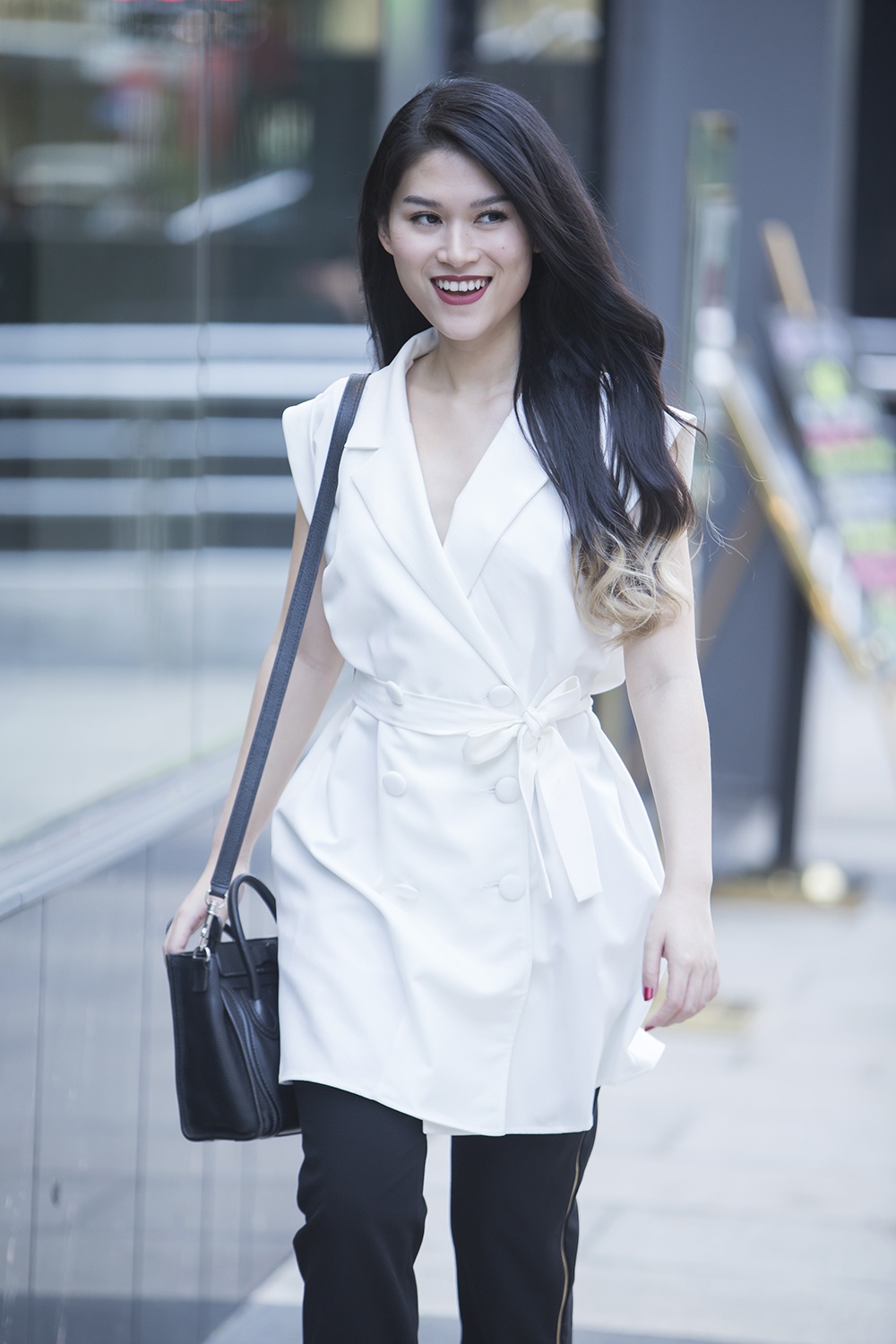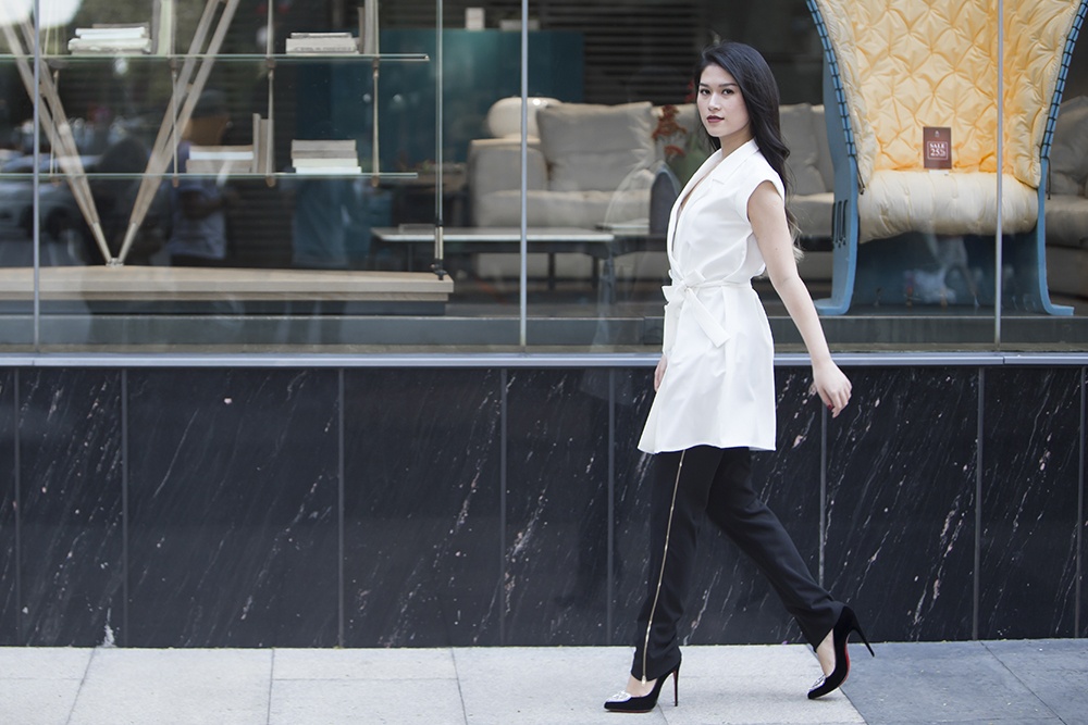 | Túi xách Celine, giày hiệu Louboutin đồng màu ăn nhập cùng tổng thể trắng đen lịch thiệp. |