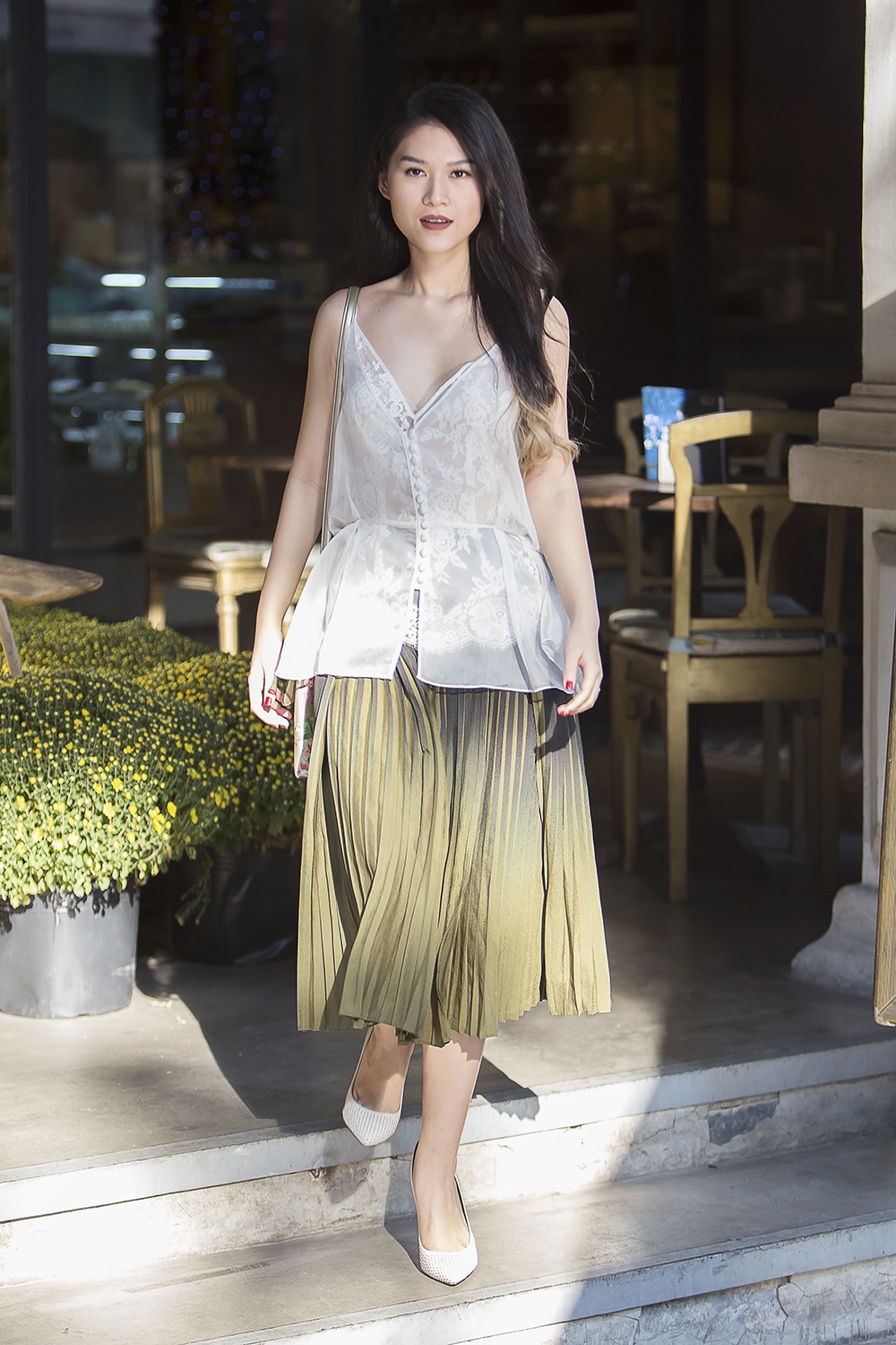 | Bộ cánh tiếp theo bắt nhịp xu hướng đang hot với áo voan mỏng xuyên thấu, chân váy xếp ly cổ điển. |