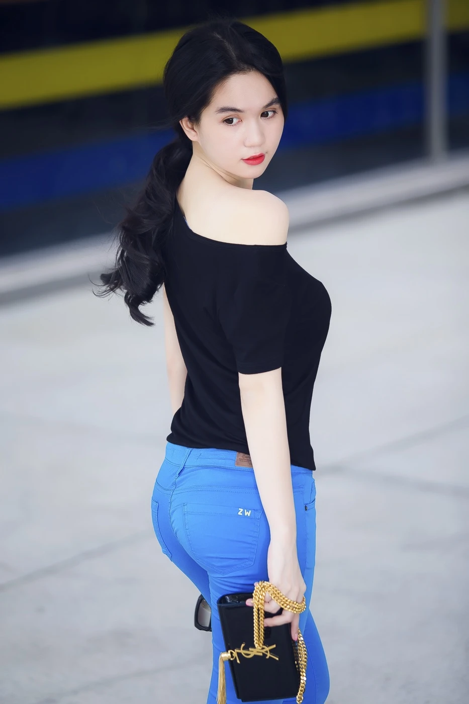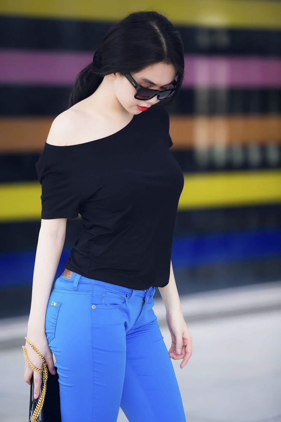 | Không chỉ diện đầm điệu đà, ''nữ hoàng nội y'' còn khá năng động với set trang phục quần jeans xanh bắt mắt và áo trễ vai tối trầm. |