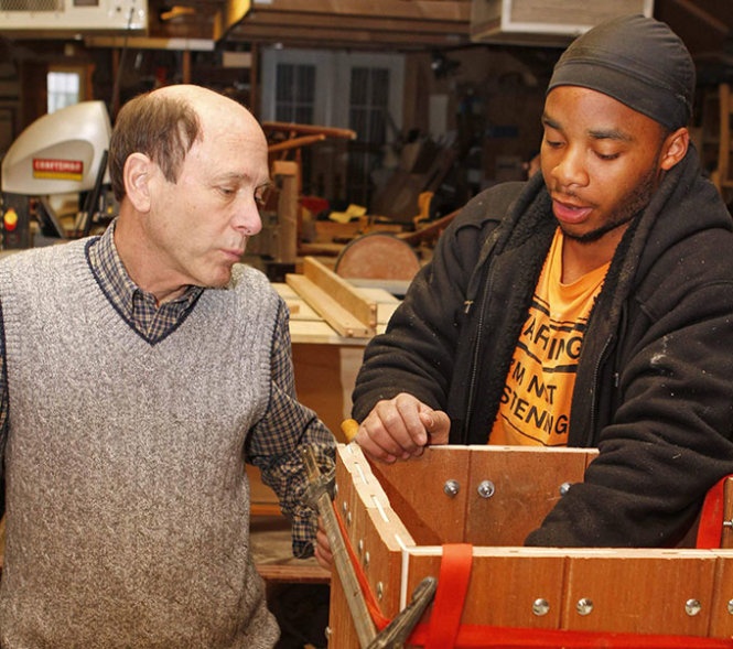 | Ông Richard Bienvenue xem sản phẩm hộp gỗ do học viên Bredarius Lanford, 19 tuổi, làm ra. |
