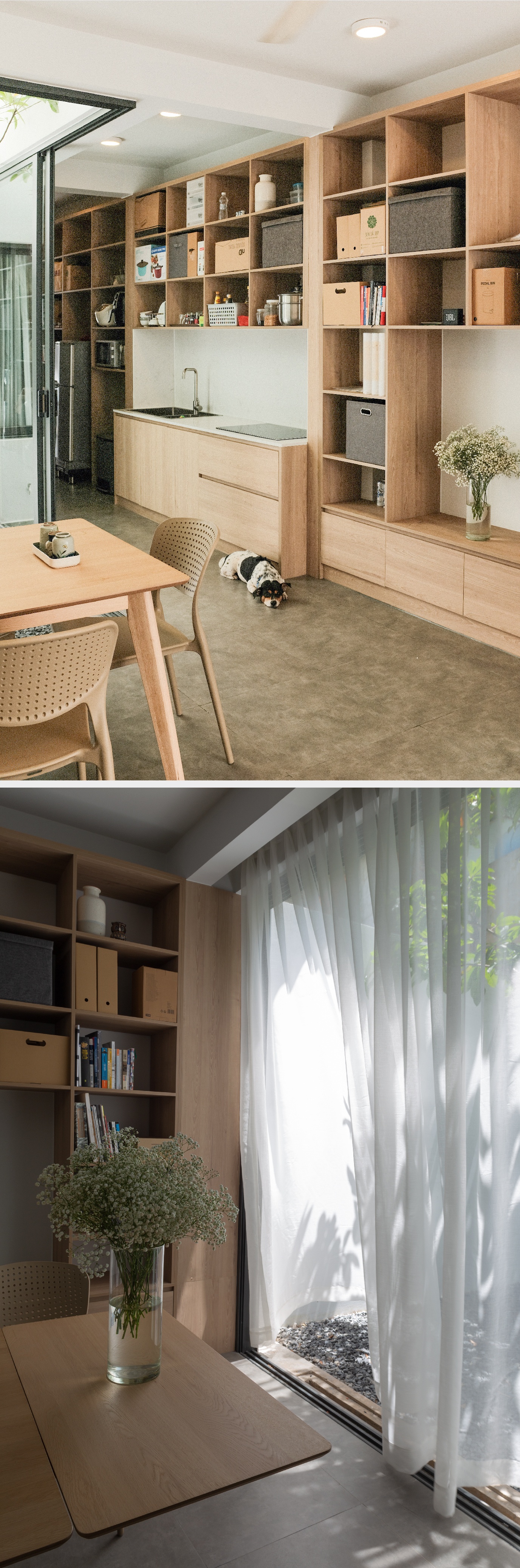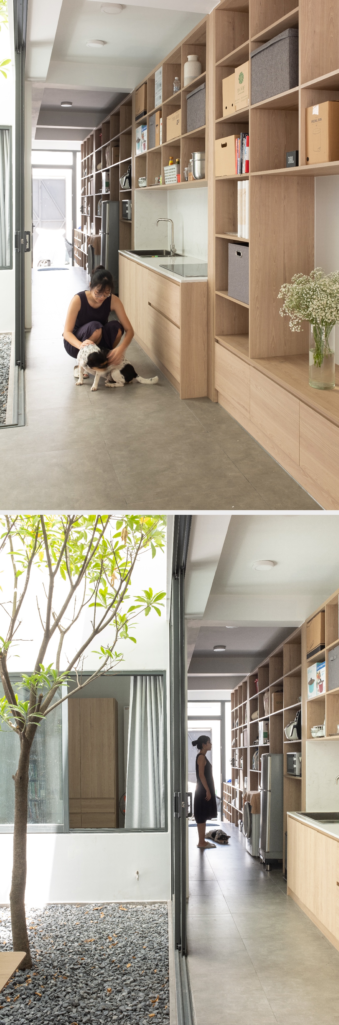 Để tối ưu diện tích, cầu thang và nhà vệ sinh đặc biệt được bố trí ở trước nhà. Còn phòng khách, phòng ăn và nhà bếp ở trung tâm, được kết nối bởi một hành lang dài có kệ 14 m. Chiếc kệ này được tích hợp để bài trí đồ dùng cho nhiều mục đích khác nhau, như giày dép, sách, các thiết bị nấu ăn,...