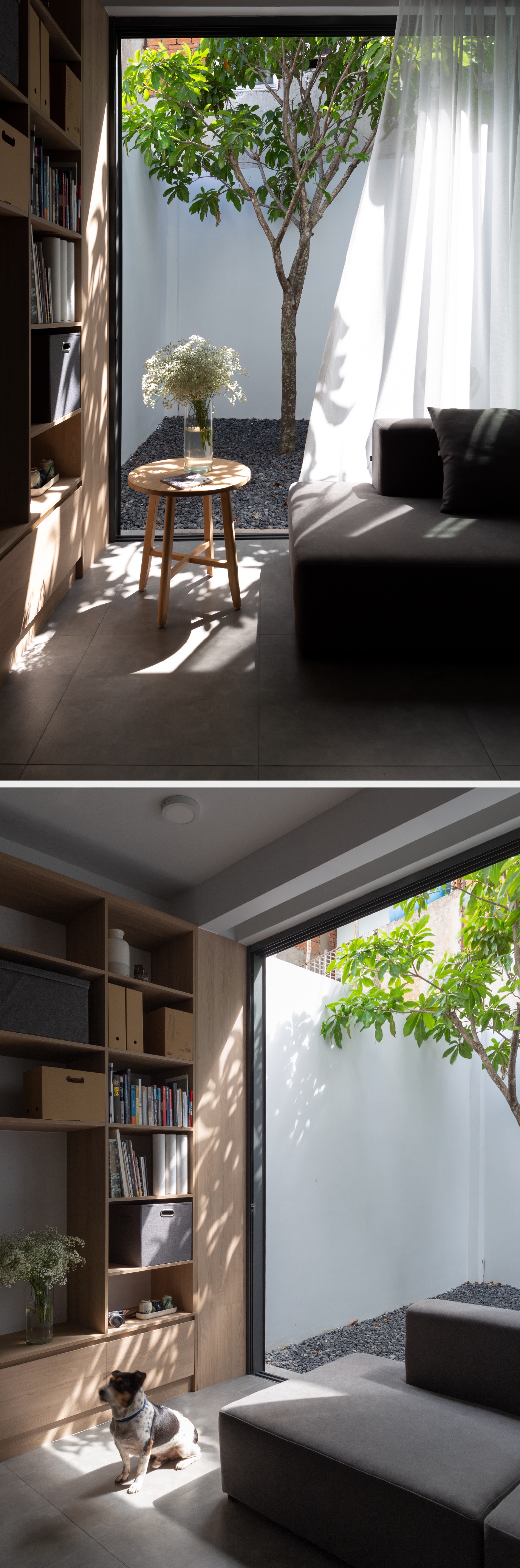 Tuy nhiên, tổng thể nhà không vì vậy mà trở nên tù túng. Bước vào bên trong, căn nhà ống thậm chí có dư khoảng trống làm sân trước, sân sau. Giữa nhà là giếng trời với cây xanh mướt, mở ra không gian hài hòa, gần gũi với thiên nhiên.