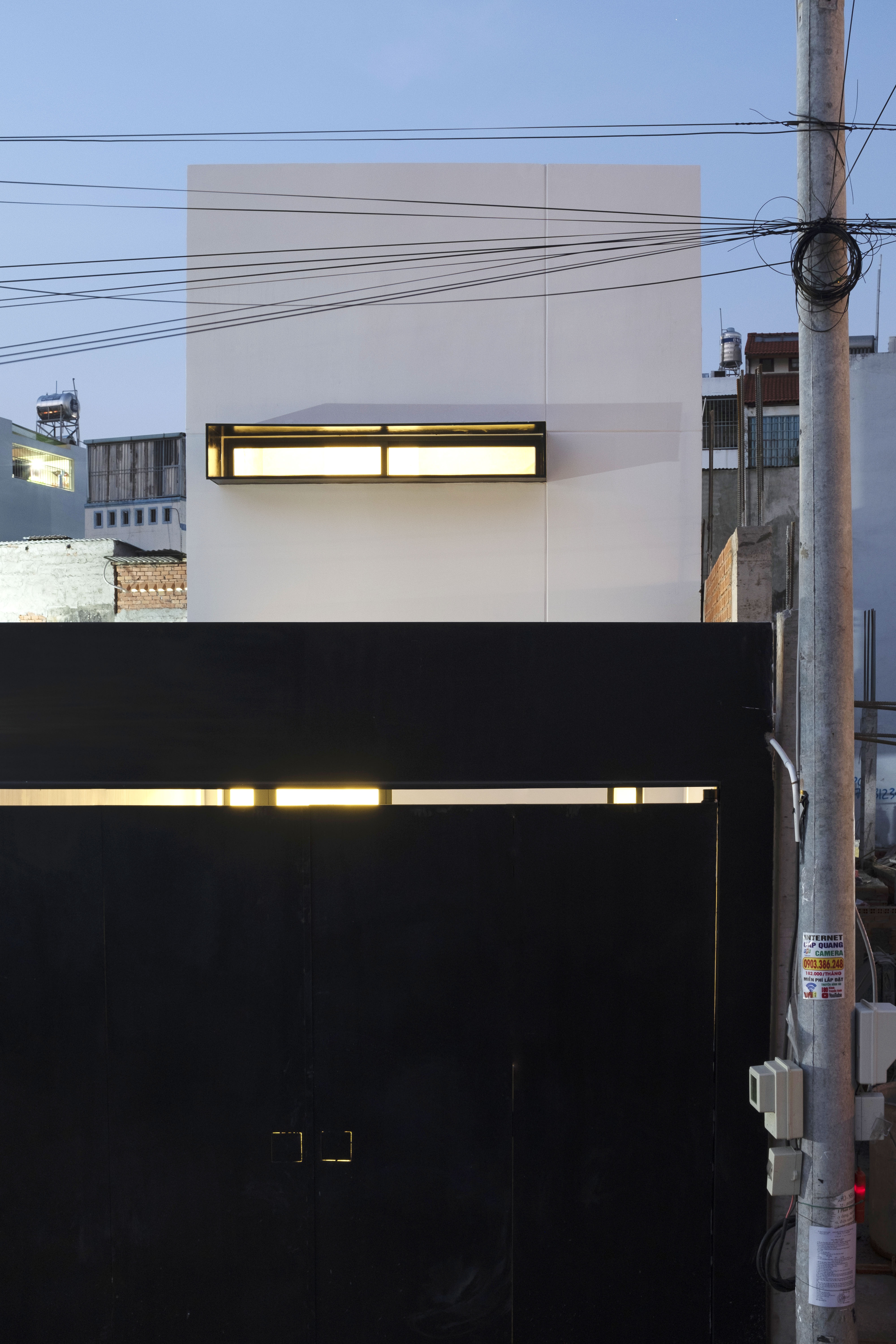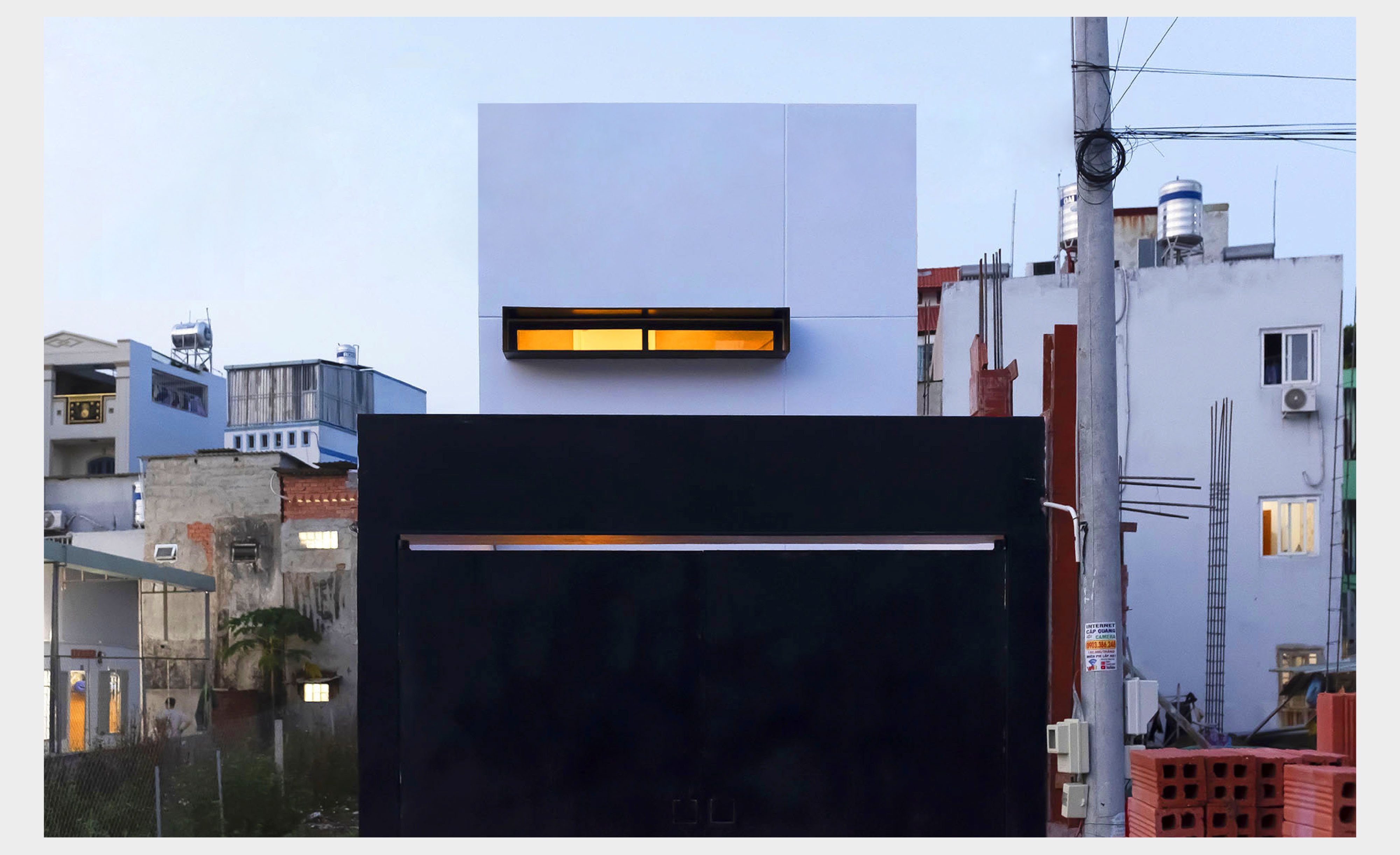 Với yếu tố hướng nội, căn nhà tập trung hướng vào bên trong thay vì "mở" với không gian ngoài. Điều đó được thể hiện qua thiết kế mặt tiền đen, trắng đơn giản. Không ban công, không trang trí cầu kỳ, mặt trước ngôi nhà chỉ có khoảng hở hẹp để thông gió và đón nắng sớm.