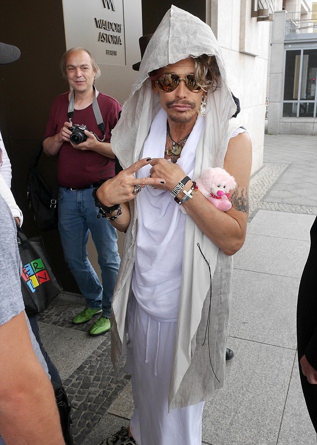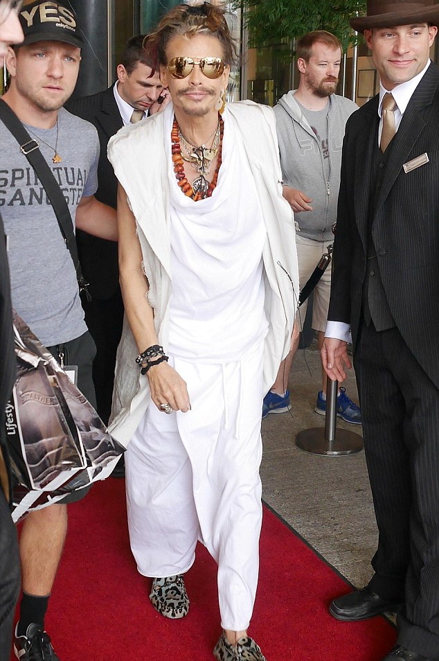 Thủ lĩnh 66 tuổi của nhóm nhạc rock Aerosmith lừng danh xem ra ngày càng muốn khẳng định biệt danh “người không tuổi” của bản thân. Vừa qua, ông bất ngờ xuất hiện trước người hâm mộ tại nước Đức với bộ trang phục hết sức khó tả. Ngôi sao mặc một tấm áo bên trong như tã trẻ em, khoác một chiếc áo ghi-lê bằng vải thô bên ngoài cùng nhiều phụ kiện như vòng, nhẫn, dây chuyền và ôm cả… một con gấu bông màu hồng. Phong cách của Steven Tyler khá luộm thuộm và trông chẳng khác gì một đứa trẻ lên ba.