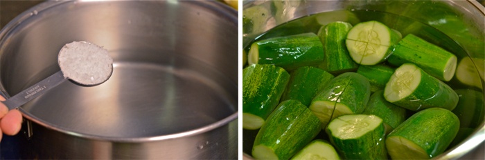 Bước 2: Cho ít muối vào nồi nước sạch, sau đó đun sôi và đổ phần nước sôi này vào thau đựng dưa. Ngâm dưa trong nước nóng khoảng 45 phút để dưa mau ngấm và vẫn giữ được độ giòn sau khi chế biến.