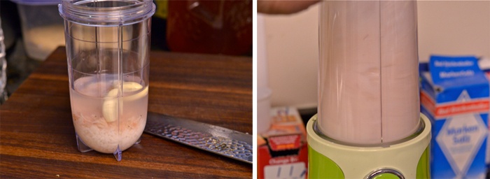 Bước 3: Trộn 1/4 chén nước cùng với tôm, cơm nguội, tỏi, gừng vào máy xay sinh tố và xay nghiền cho thật nhuyễn.