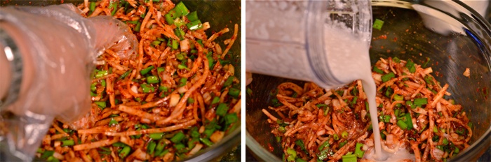Bước 4: Chế biến nhân kim chi bằng cách cho củ cải, hành tây, hẹ, ớt bột, nước mắm, đường vào một tô lớn rồi trộn đều tay. Cho hỗn hợp vừa xay nhuyễn vào trộn đều tới khi ớt lên màu đỏ đẹp và gia vị thấm sâu vào nhân.
