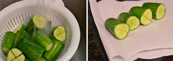Bước 5: Sau khi ngâm 45 phút, rửa sơ dưa lại với nước lạnh, vớt dưa ra và xếp lên khăn giấy cho ráo nước.