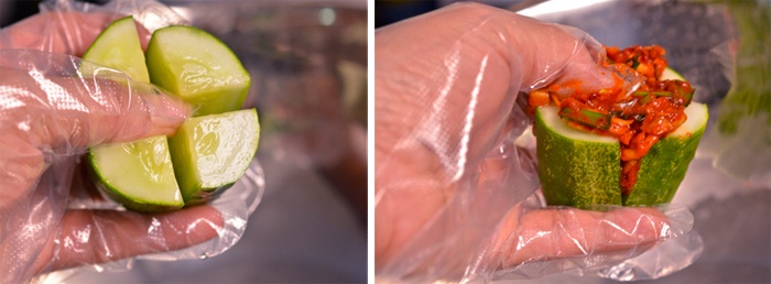 Bước 6: Nhẹ nhàng tách dưa ra, bỏ nhân vừa trộn vào giữa. Bôi các kẽ đã chẻ của quả dưa cho thấm đều gia vị. Tiếp tục phết đều phần nhân ra ngoài quả dưa. Làm lần lượt với toàn bộ số dưa đã chuẩn bị.