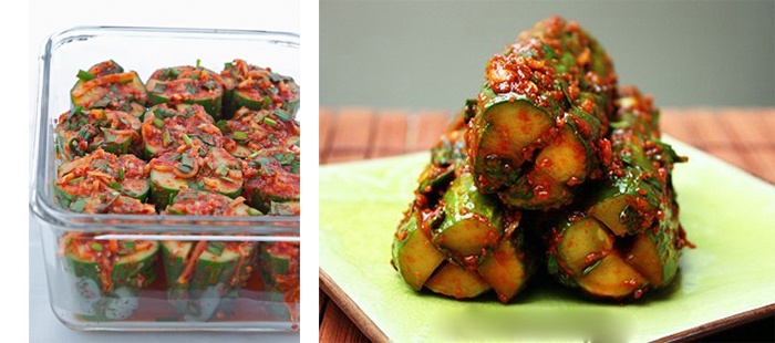 | Kim chi dưa leo là một trong những món ăn rất phổ biến trong ẩm thực Hàn Quốc. Màu xanh bóng của quả dưa và lá hẹ hòa lẫn cùng màu đỏ tươi của ớt Hàn Quốc, màu vàng của gừng và mè tạo nên một món ăn vừa đẹp mắt vừa ngon miệng. |