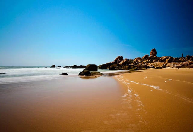 | Nếu không thích đi thuyền qua đảo, bạn có thể tham quan bãi đá Kê Gà, lội bộ qua vũng cạn để đến bến thuyền gần đó. Đá ở bãi có hình thù rất ấn tượng, biển xanh trong rất đẹp. |