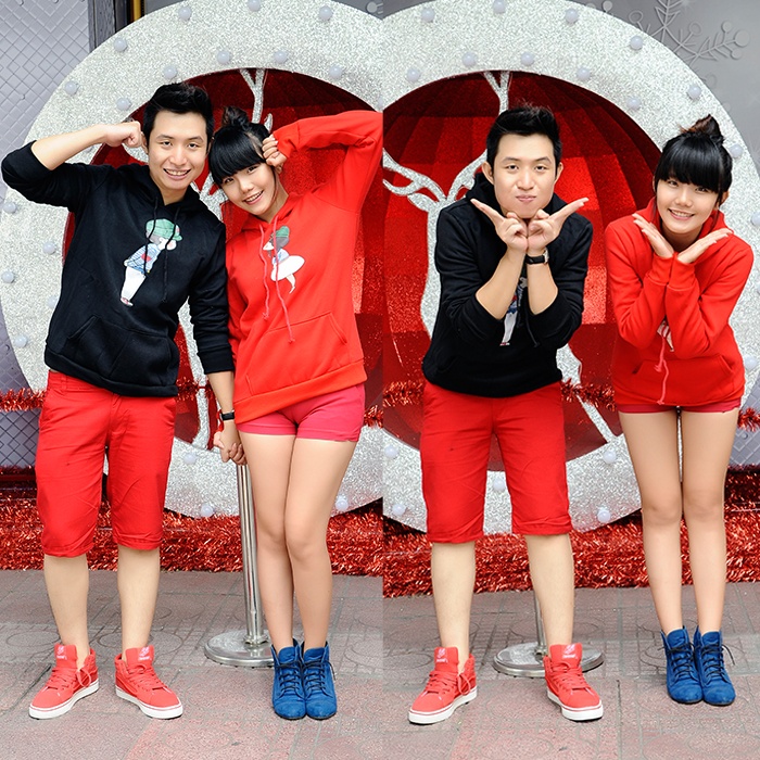 | Cặp đôi “gà bông” trẻ trung và nổi bật với áo khoác họa tiết “chàng - nàng” giá 510.000đ thật ngọt ngào. Sự phá cách khi lựa chọn hai tone màu khác nhau đem đến sự mới lạ cho xu hướng áo cặp. |