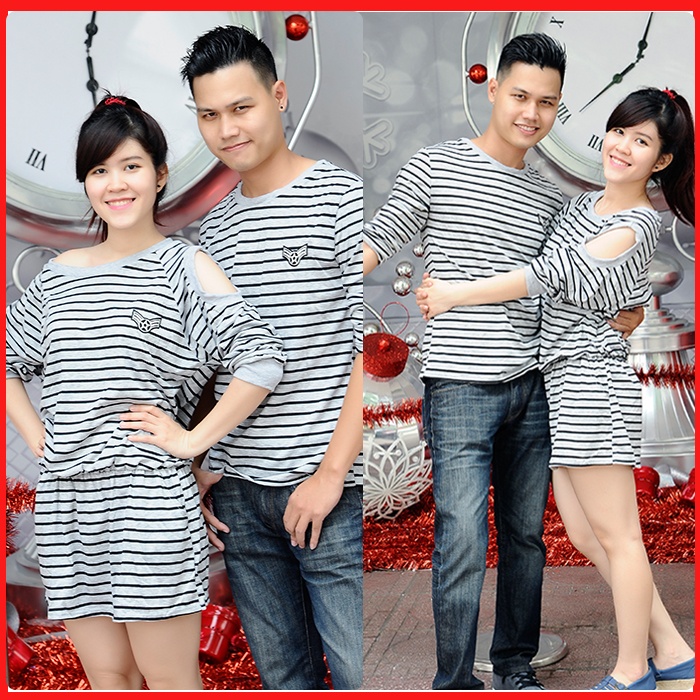 | Những đường kẻ sọc ngang đen trên nền xám của bộ đồ đôi này chẳng những không lỗi thời mà đem đến sự trẻ trung, năng động cho đôi tình nhân. |