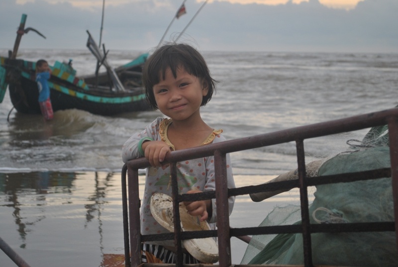 | Vẻ mặt hồn nhiên của một cháu bé gái đứng đợi cha đưa cá tôm về bờ. |