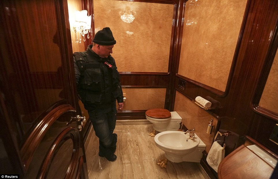 | Một người biểu tình khám phá nhà vệ sinh của Yanukovych. Ảnh: Reuters |