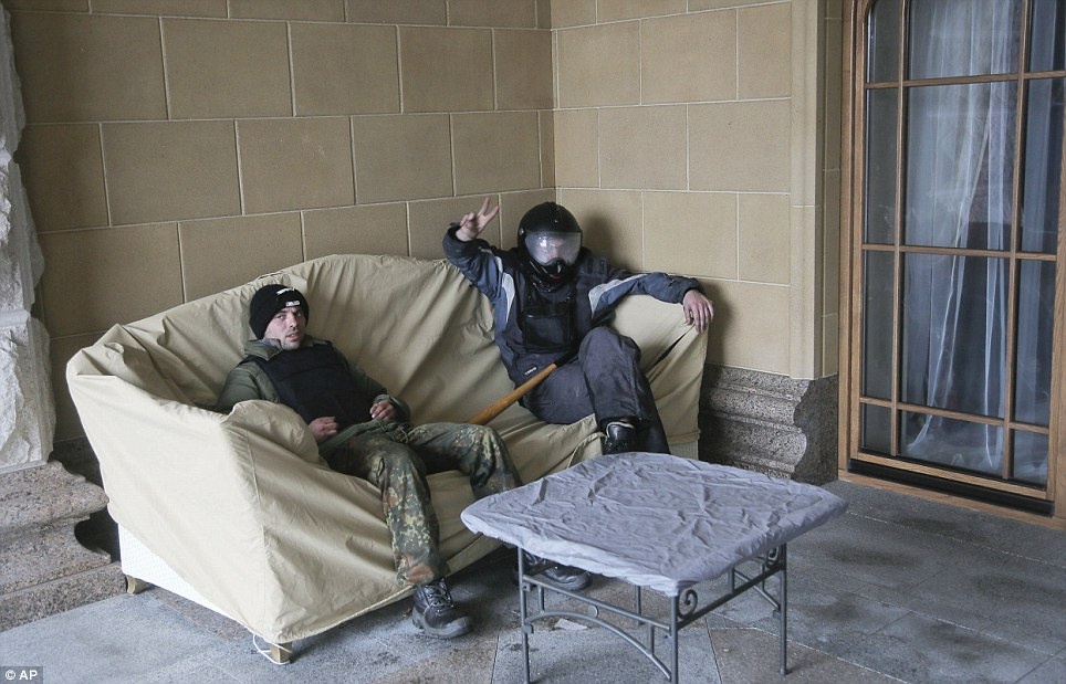 | Hai người biểu tình tạo dáng trên ghế sofa. Ảnh: AP |