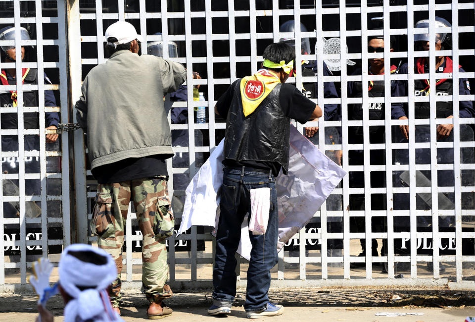 | Đám đông phong tỏa lối vào một đồn cảnh sát gần sân vận động thể thao tại Bangkok hôm 23/12. Sự hiện diện của họ khiến các đảng không thể đăng ký tham gia bầu cử. Bất chấp nỗ lực của họ, hơn 20 đảng đã đăng ký bầu cử. Ảnh: AP |